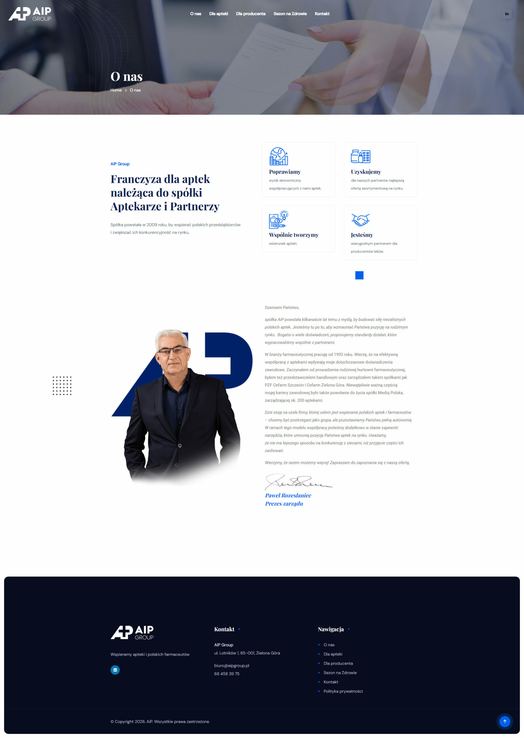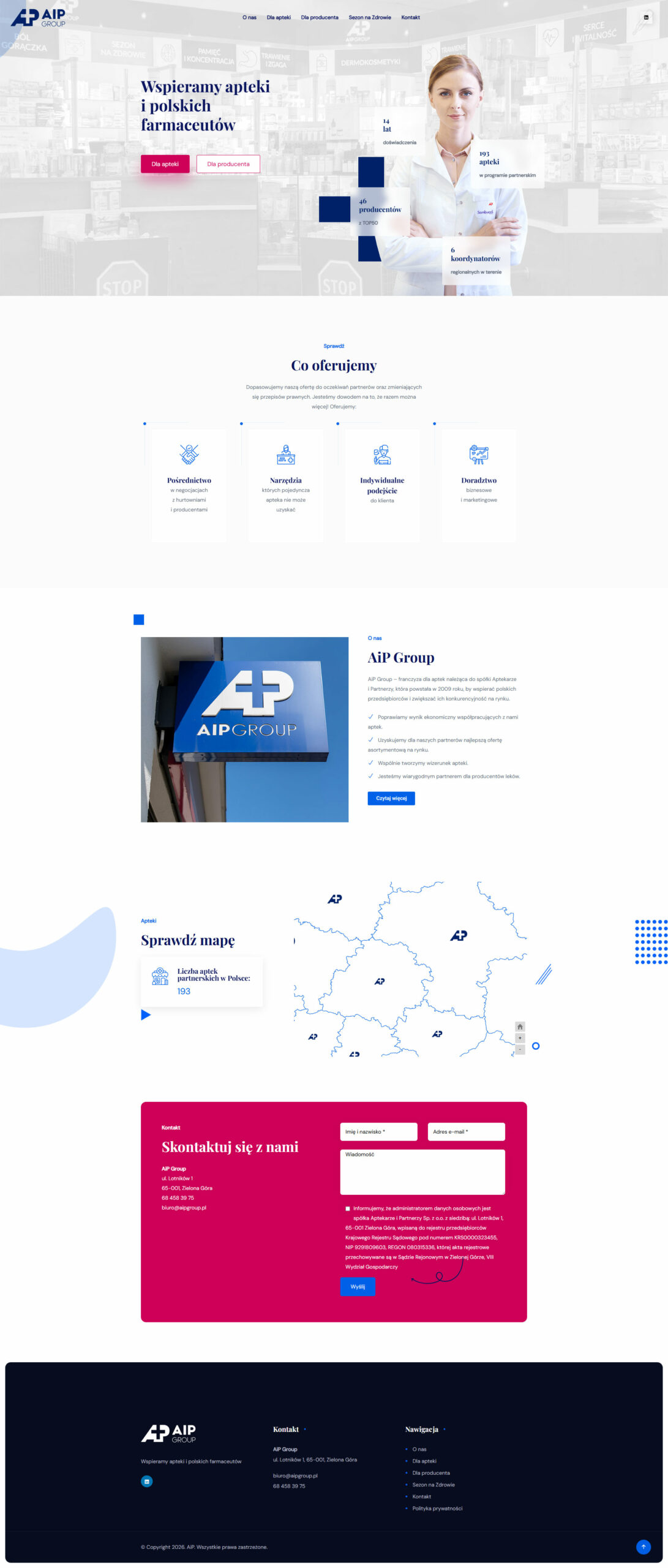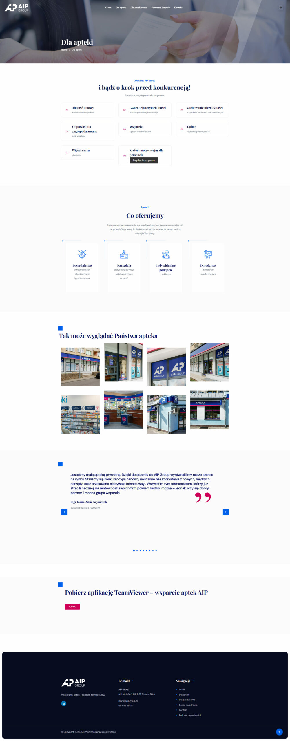 AiP Group – franczyza dla aptek należąca do spółki Aptekarze i Partnerzy, która powstała w 2009 roku, by wspierać polskich przedsiębiorców i zwiększać ich konkurencyjność na rynku.